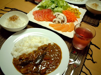 ●ナス&挽肉カレー・・・玉ねぎのみじん切りをキツネ色になるまで炒め、すりおろした人参、ナス、マッシュルーム、いためた挽肉、水250ccを入れてコトコト弱火で煮込む。