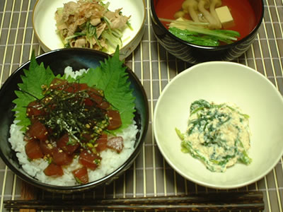 6月1日(火) *まぐろの漬丼 *ホウレン草の白和え *水菜の冷しゃぶサラダ *豆腐としめじのすまし汁