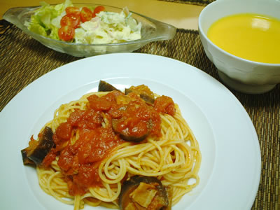 こってりなメニューに見えると思いますがヘルシーを心がけて作りました。パスタソースにはオリーブオイルを使わずベーコンの油分だけ。あとはにんにく、トマトとナスを入れてコトコト煮詰めました。にんじんスープも人参3本と牛乳とコンソメ1個でノンオイル。なるべく美味しくヘルシーなメニューで作っていこうと思います。 |