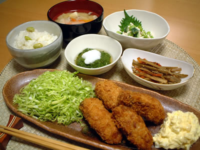 *牡蠣フライ *ごぼうのキンピラ *山かけめかぶ *枝豆の白和え *味噌汁