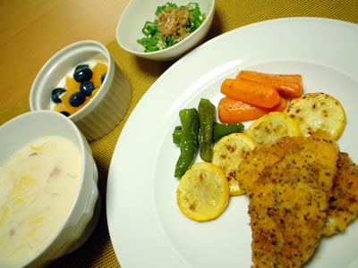*カレイのハーブ焼き *白菜とベーコンのミルクスープ *おくら *フルーツヨーグルト