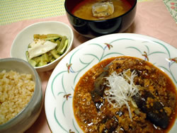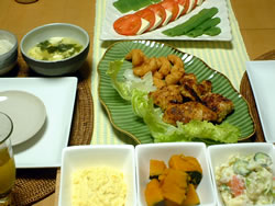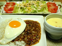 友達からタイ土産でもらっていたグリーンカレーペーストを使用して作りました。すんごい激辛なんですよ! イエローカレーなど激辛ものに強い私でさえ参りました!と言いたくなるほど辛かった。急いでココナッツミルクを買い足しに出かけたけど、こんな時に限って見つからないんですよね〜 ごっちは鼻水たらしなから食べてました(笑)