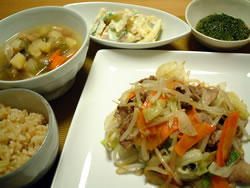 食物繊維たっぷりの夕食でした。 具だくさんの野菜スープの中には【人参・ジャガイモ・ピーマン・玉ねぎ・セロリ・トマト・豆4種類・ベーコン】コンソメと野菜の旨みだけのあっさりした味つけです。美味しく野菜をたくさんいただける1品です。