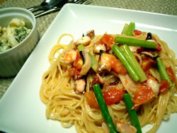 久々にパスタが食べたくなりました。麺好きなので毎日パスタでも平気なのですがカロリーを考えると・・・ パスタソースの作り方 1. フライパンにオリーブとスライスしたニンニク、唐辛子を入れて弱火で香りを出す。 2. 十分に香りが出たらタコとカットトマトと茹でたアスパラを入れて軽く炒める。 3. 麺を入れる直前に生クリームを入れて、すぐに麺を加えささっと和えて出来上がりです。