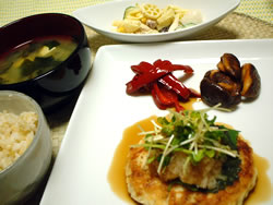 豆腐ハンバーグ。私は豆腐3割、鶏挽肉1割の割合で作っています。そのほか人参、玉ねぎ、食感を良くするために蓮根もみじん切りにして入れています。 豆腐だけだとあっさり物足りない感じになってしまいますが、鶏胸肉の挽肉よ入れることによってハンバーグを食べた!って満足感が得られます。胸肉だったら脂肪も少なくてヘルシーだしね。