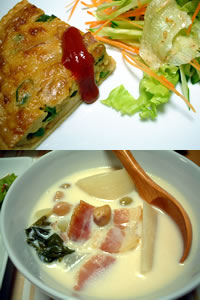 パイ生地を土台にキッシュを焼きました。 生地を作るのに疲れてしまい、今日はこの2品でおしまいです。おまけに味はイマイチ。 今日のキッシュは某雑誌のレシピを参考に作ってみました。パイ生地は合格でしたが、フィリングは4分の1切れ食べるのが精一杯なくらい美味しくなかった。 いつもの私のレシピでは、具材を炒めて生クリームと卵のみで生地を作って焼き上げるとふんわりまろやかな味わいに出来上がります。今日のはパルメザンを大量に入れたのが大間違いだったんだわ。 某雑誌に一言、不味いレシピを載せるなー!