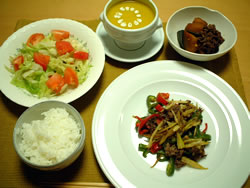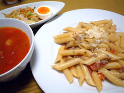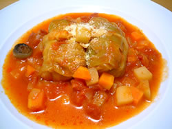 カポナータとはイタリア・シチリア地方の料理で野菜のトマト煮です。彩の良い野菜をトマトで煮込み、冷めてもおいしくいただけます。これは前菜として出されるものですが、今日はチキンをガーリックオイルで焼いたあと、一緒に入れて煮込みました。立派なメイン料理の完成。