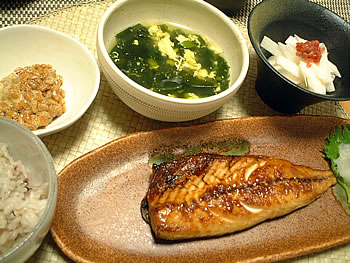 なのであっさりめに焼き魚。魚焼いてパパッとわかめスープ作って手抜き料理ですが、こんな食事を続けたら太りはしないだろうなぁと思ったのでした。