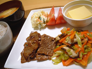 牛肉は黒胡椒と焼肉のタレをかけて焼いただけ。炒めただけの野菜と手抜き料理ですが平日はこんなもんでOKでしょう。