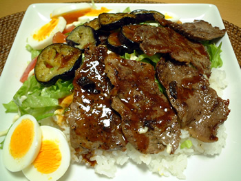 ご飯の上にレタス、トマト、卵、ナス、牛肉をドドーンと乗っけてタコライスっぽくしてみました。