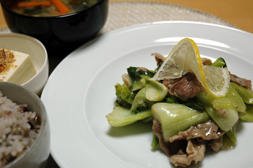 豚肉と青梗菜を炒める、味付けは中華調味料と塩、ブラックペッパー。