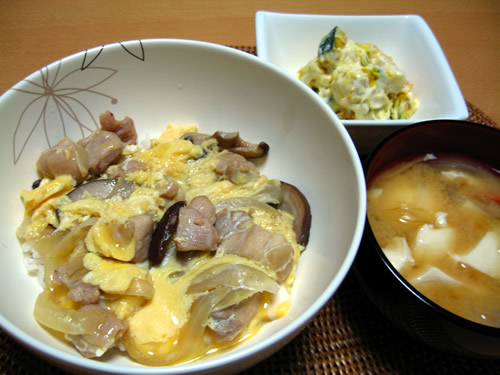 * 親子丼 * カボチャとエビの豆腐マヨサラダ * おぼろ豆腐の味噌汁