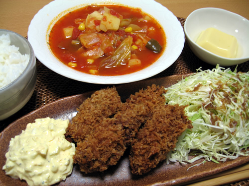 この秋初の牡蠣フライ。揚げすぎて焦げっぽい味がした。せっかくタルタルも作ったのになぁ。 オットに話しかけられたら揚げ物してるにもかかわらずリビング行って話しこんでしまうからこんなことに・・・。注意力がホントにないんです私。 スープはベーコン、キャベツなどをトマトとコンソメで煮込みました。野菜をたくさん摂りたい時には野菜スープがオススメ。