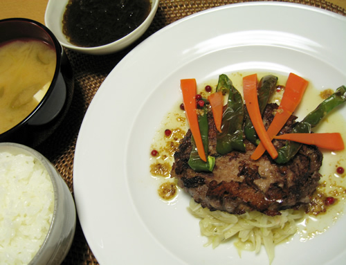 牛のファルシーって何?とお思いでしょう。簡単に言うとハンバーグを牛肉で巻いて輪切りにしたようなものです。 なんだか今日は和あり、洋ありでまとまりのないメニューになってしまいました。でも、お肉の時は酢物や味噌汁など低カロリーなものじゃないといけないような気がして・・・・