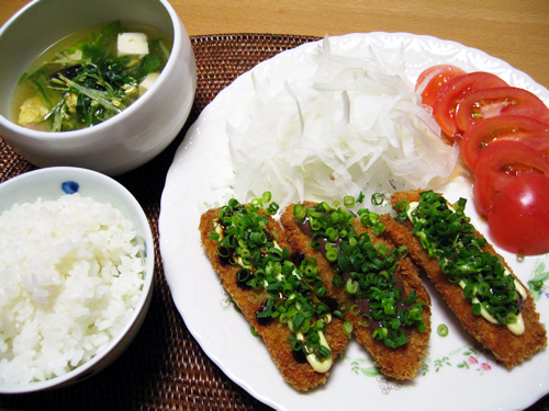 魚さばきが出来ないので、鯵フライ用にちゃんと調理してあるのを買ってきたのに、せいごもウロコもついてるままだし、骨もいっぱいあるし、これじゃ私食べれない。。気持ち悪いので皮を全部剥ぎ取って、骨を全部抜いて(オットの毛抜きをこっそり使用)こんなに小さくなってしまいましたが、ちゃんと鯵フライが完成。小ネギと玉ねぎをのせてさっぱりといただきました。 魚調理が上手になりたいよー