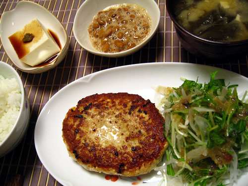 若干、ほんの若干ですがダイエット中なので多少ヘルシーな献立にしています。 ササミをフープロで荒く刻んで豆腐とまぜてハンバーグに。かなりあっさりした味ですが、一応ハンバーグを食べた!って気分になれるので満足はできる。 しかし、一向に体重は減りません。