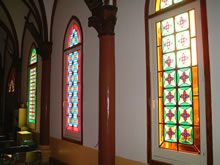 赤いレンガ作りの教会で海を見下ろす高台に建っている。この教会で素敵だなぁと思ったのは側面の花柄のステンドグラスとアーチ型の天井。教会建築で有名な鉄川与助氏の手がけた教会です。五島の有名な教会はほとんど手かげており、九州内では50以上の教会建築にかかわっているそうです。ほんとに素晴らしい建造物だと思う。教会好きな方は「おじいちゃんが建てた教会」を参考にされてはいかがでしょう。