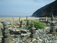 まずは「日島曲遺跡古墳群」を見に行った。海辺にさまざまな形の石塔や石碑がばらばらと無造作に建てられいる。海を眺めるように建てられていて、この石碑は鎌倉時代後半からのものだそうです。ほんと不思議な風景でした。
