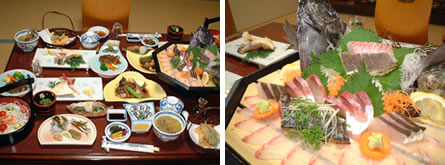荒川温泉の豆谷旅館は荒川港の目の前にあって宿から漁船が行き交うのを目にする事ができる。のんびり堤防に座って釣りをしてる人もいるしのんびりムードでいい感じです。女将さんに日没の時刻を教えてもらってお楽しみの夕食をいただくことにした。へへ、やっぱり今日も豪華な晩餐だ!