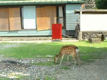 次に向かったのはすぐ近くの若松ディアパーク。野生の鹿を見れるということで車を走らせた。日島曲遺跡古墳群からすぐ近くで看板はあるんだけど、ディアパークらしきものは見当たらず、看板を見てみるとどうやら私たちディアパーク内にいるらしい。あれ?ディアパークって囲いがあって簡単な動物園というかそんな風になってるのかと思ったら、勝手に民家の方へ鹿が降りてくるので勝手に見てくださいというわけで、その地域がディアパークと呼ばれているらしい。(確かかどうかは不明)ってことは、行けば絶対見れるってわけじゃないみたい。私達もあきらめて帰ろうとUターンして戻っている途中で「うわーっ、いた!」民家の庭の草を食べてる鹿に遭遇したのです。そしたらぞろぞろ山から鹿が降りてきた。パンを差し出したら人見知りすることなく近づいてきたから人間馴れてるんだろうね。