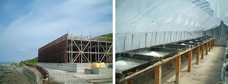 まず海水をネットを伝わせながらじわじわと蒸発させ濃い濃度の海水を作るらしいです。(写真左)そして濃い海水ができたら結晶箱に入れてじっくりと天日干しされて出来上がりとのこと。(写真右)けっこう時間がかかるものなんだなぁ。ここでは「とっぺん塩」と「とっぺんにがり」を作っている。運悪く、そのときの私はあんまりにがりに興味なかったの。その後でテレビ見てダイエットに効果抜群ってのを知ってにがり買ってくればよかったーとかなり後悔。