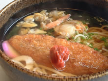 今日のお昼はテレビチャンピオンで有名になった五島うどんの「竹酔亭」。駐車場にはレンタカーがいっぱい止まってたってことは、やっぱりテレビを見た観光客が足を運んでるんだろう。私もその一人だけど。五島うどんの地獄炊きが有名なんだけど、夏場はやってないということで私はごぼう天うどん、弟は磯うどんを注文した。この写真が磯うどん。ホタテ・えび・アサリ・魚のフライ・梅干というなんとも不思議な具が乗ってるけど美味しかった。