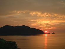 と、そこへ女将さんから「夕日が沈みかけてますよ!」 と電話が入ってきた。食事はまだ途中なので引かないで下さいね!と念を押し急いで魚藍観音までぶっ飛ばし。走っている間にもぐんぐん夕日が沈んでてドキドキしながら向かったけどやっぱり間に合わなくて途中で車を止めて写真を撮った。
