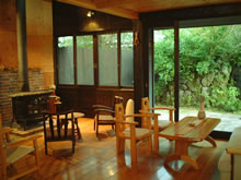このお宿で気に入ったのは談話室があること。「道草」という広い談話室があって、暖炉があり、中庭を眺めながらコーヒーが飲めテーブル、隣の部屋にはテーブルと椅子がいくつもあって読書やおしゃべりができるようになっている。小さいけど本棚もあるしね。そして中2階にはソファがあり空が見えるように天窓になっていた。寝転がって本読んだり、お茶飲んだり、とってもくつろげるスペースですごくよかった。