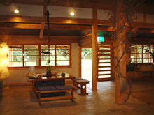 入り口の両脇に木々が植えられていて木漏れ日の中母屋へ歩いていく。昔ながらの土間のような開けっぴろげ、その母屋の目の前は広い中庭があってこれまた気持ちいい。早速チェックイン、愛想のいいスタッフの方がいろいろ説明してくれ部屋まで案内してくれました。